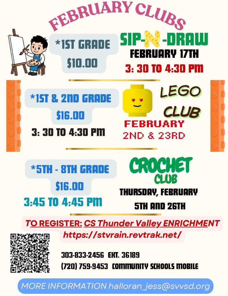 Parent teacher conferences are right around the corner! The signup information for Meet The Teacher went out on Monday, January 26th. Parent Teacher Conferences are February 10th and 11th from 3:50-8:00pm and February 12th from 3:50-5:50 pm. We look forward to seeing our families and connecting with you. If you need assistance navigating Meet The Teacher, please contact Laura at the front office at (303) 833-2456 or email [email protected], so that we can help you.