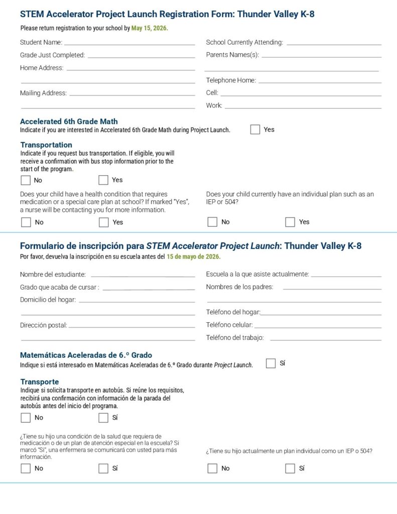 We are currently accepting registrations for our upcoming STEM Project Launch Summer Program. Please see the attached registration form for more information. You can bring the registration to the front office or email Mr. Elwood. This is open to our current 5th, 6th, and 7th grade students. Email Mr. Elwood at [email protected] for more information.