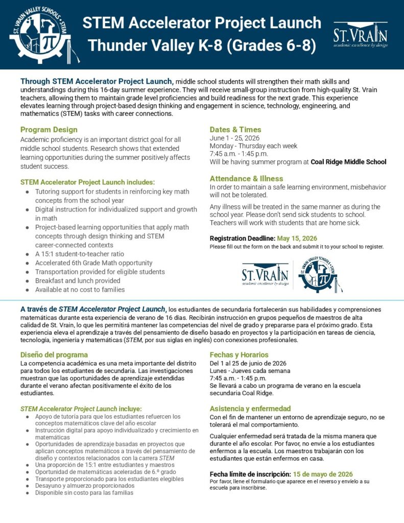 St. Vrain Valley Schools invites the community to attend our first-ever Future Ready Festival. This district-wide open house allows visitors to explore the innovative programs and pathways that define the St. Vrain Advantage. Event Details Saturday, March 7 from 2:00-6:00 p.m.Silver Creek High SchoolFree and open to the public Join Us The Future Ready Festival […]